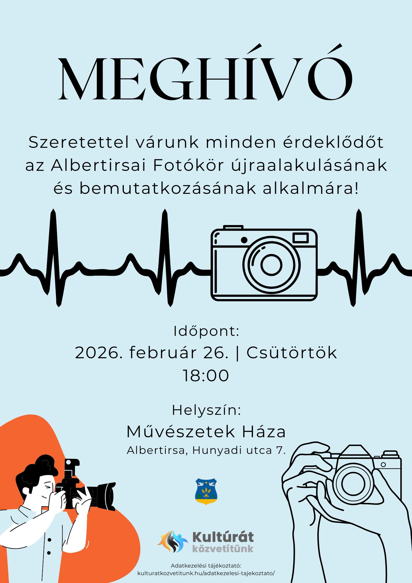 Kedves Vendégeink! Szeretettel hívunk és várunk minden érdeklődőt az Albertirsai Fotókör újraalakulásának és bemutatkozásának alkalmára! Időpont: 2026. február 26., csütörtök, 18:00 Helyszín: Művészetek Háza (Albertirsa Hunyadi utca 7.)