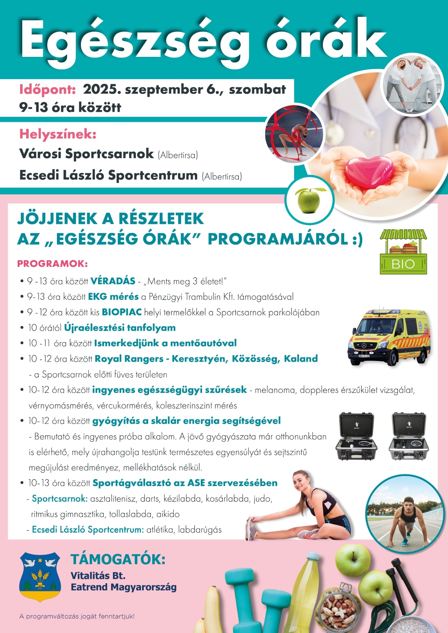 EGÉSZSÉG ÓRÁK Kedves Vendégeink! A városnapi rendezvényünk szombati napját az Egészség órákkal kezdjük 9:00-tól a Sportcsarnokban és a Sportcentrumban! Részletes program az esemény plakátján látható! Helyszín: Albertirsai Sportcsarnok és Ecsedi László Sportcentrum