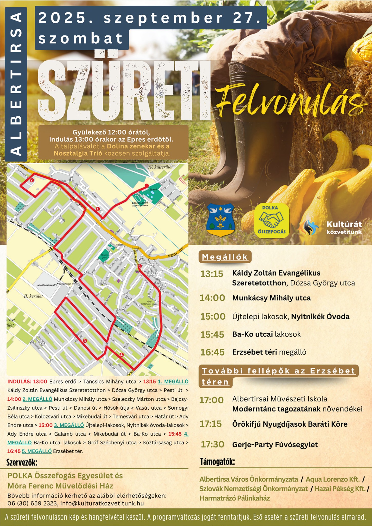 SZÜRETI FELVONULÁS Gyülekező 12:00 órától az Epres erdőnél Indulás 13:00 órakor A jó hangulatról a Dolina zenekar és a Nosztalgia Trió gondoskodik. Megállók: 13:15 – Káldy Zoltán Evangélikus Szeretetotthon, Dózsa György utca 14:00 – Munkácsy Mihály utca 15:00 – Újtelepi lakosok, Nyitnikék Óvoda 15:45 – Ba-Ko utcai lakosok 16:45 – Erzsébet tér (* részletes útvonalterv és térkép a plakáton […]