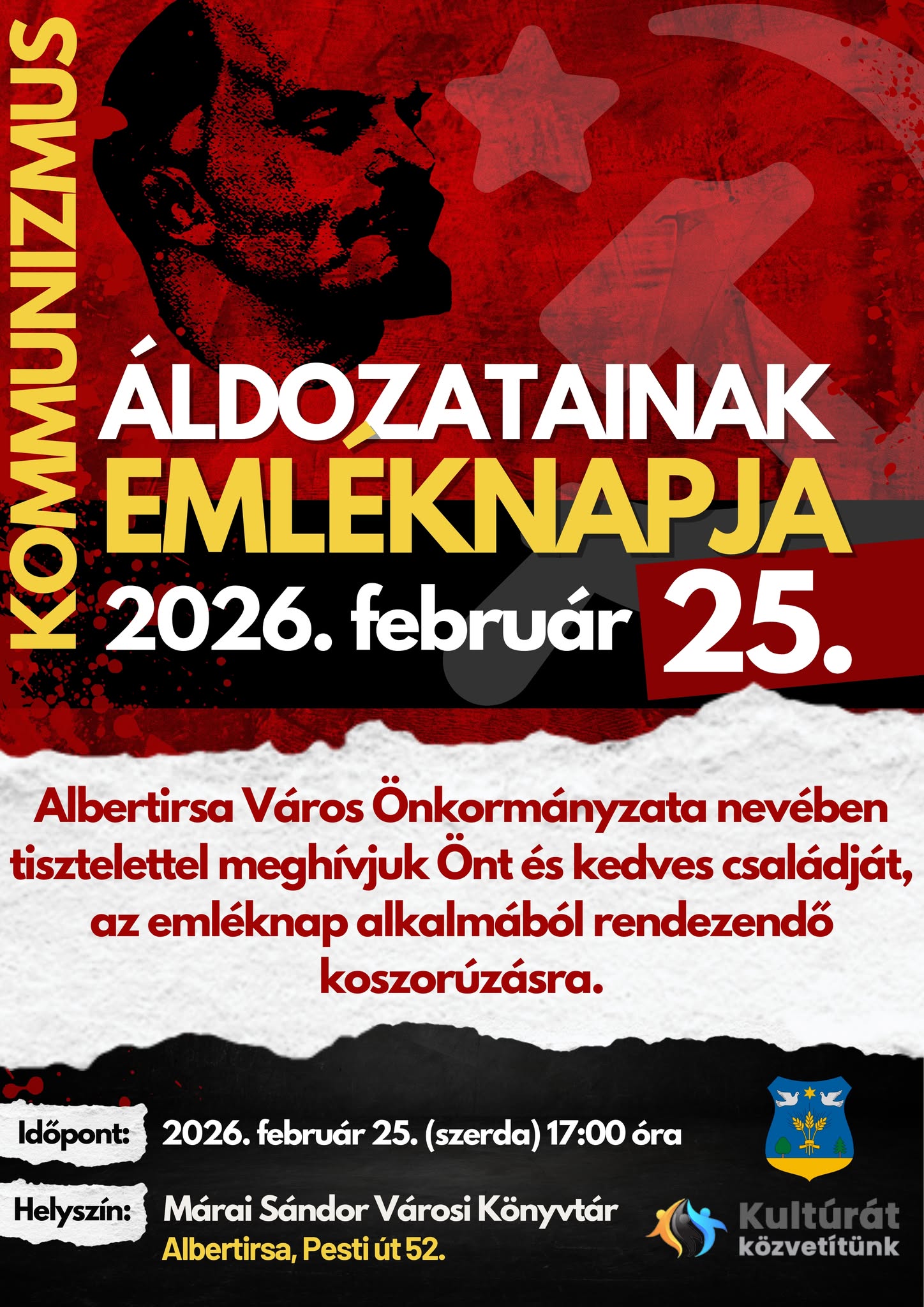 MEGHÍVÓ | Koszorúzás a kommunizmus áldozatainak emléknapján Ezen a napon közösen hajtunk fejet mindazok emléke előtt, akik a diktatúra embertelen rendszerének áldozataivá váltak, és akiknek szenvedése, küzdelme örök figyelmeztetés számunkra a szabadság és az emberi méltóság értékére. Időpont: 2026. február 25. (szerda) 17:00 óra Helyszín: Márai Sándor Városi Könyvtár (Albertirsa, Pesti út 52.) […]