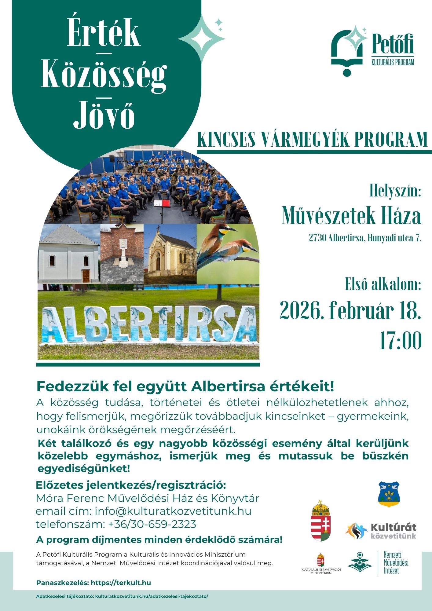 Kedves Vendégeink! Szeretettel hívunk és várunk minden érdeklődőt a Kincses vármegyék program második alkalmára, ahol tovább folytatódik a helyi értékeink megismerése! Reméljük, hogy a “házi feladatot” mindenki elkészítette! Időpont: 2026. március 19. | 17 óra Helyszín: Művészetek Háza | Albertirsa, Hunyadi utca 7. Regisztráció: Telefonon: +36/30-659-2323 E-mailben: info@kulturatkozvetitunk.hu A program díjmentes […]